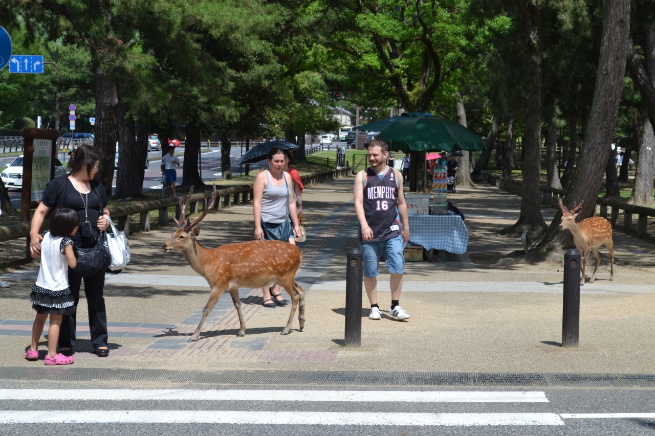 鹿せんべいがそこら中で売っていますが、なぜか売り子の方には近づかず、観光客が購入したとたんに、一斉に集まってきます。