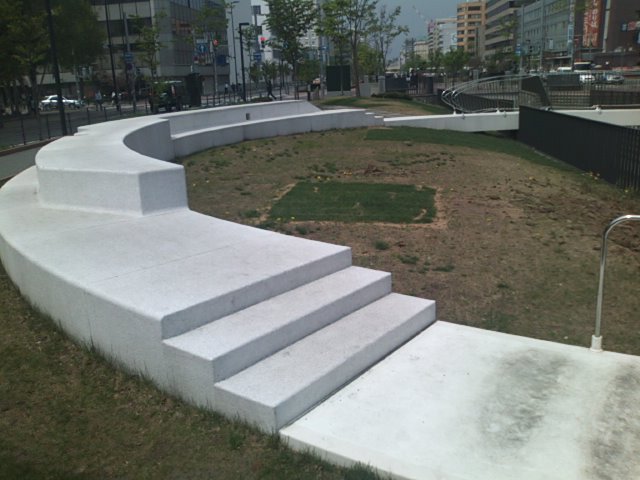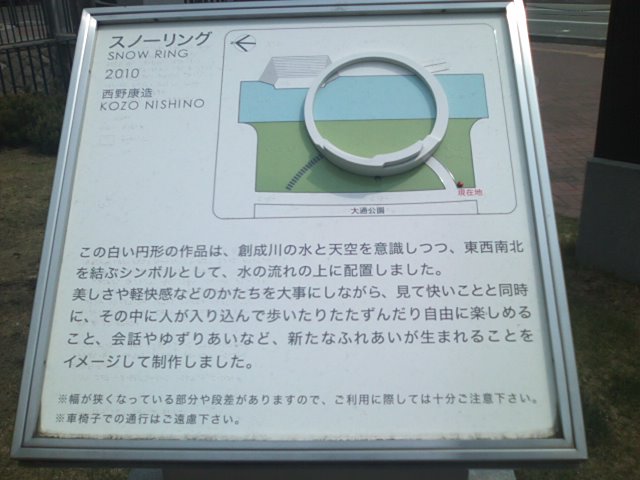 創成川公園内の、丁度テレビ塔と中央バスターミナルとの間付近にあるのがこちらの巨大な”作品”で、スノーリング、という名称で親しまれています。スノーの名が示す通り、白色を基調とした環状のオブジェで、一周できるようになっていますが、その各所の状態は一様ではなく、色々な段差や幅の違いなどがあって、山あり谷ありの人生が凝縮されているような、何とも意味深な作品だなと感じました。