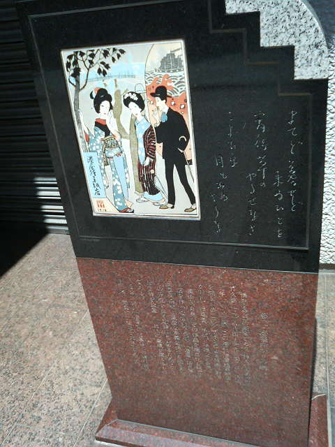 大正浪漫の叙情画家・竹久夢二が開いた「港屋絵草紙店」の跡地で、石碑には彼の作品である詩と絵が描かれています。