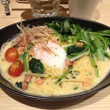 スープパスタと称して過言ではないと思えるサラサラのソース、優しい感じ且つ味もしっかりしていて大満足です!