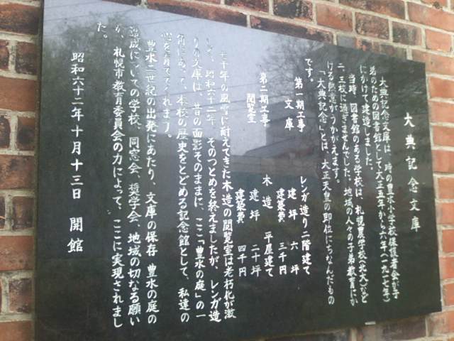 豊水小学校は、今から約10年前に近隣小学校との合併により廃校となった小学校ですが、建物はそのまま色々な施設に生まれ変わって運用されています。旧校舎の離れにあるレンガ造りの建物がこちらで、この一角全体が「豊水の庭」と名付けられ、ノスタルジックな雰囲気を醸し出した素敵な空間として維持されています。あずまやなどもありますので、休憩などに立寄ると良い場所だと思います。