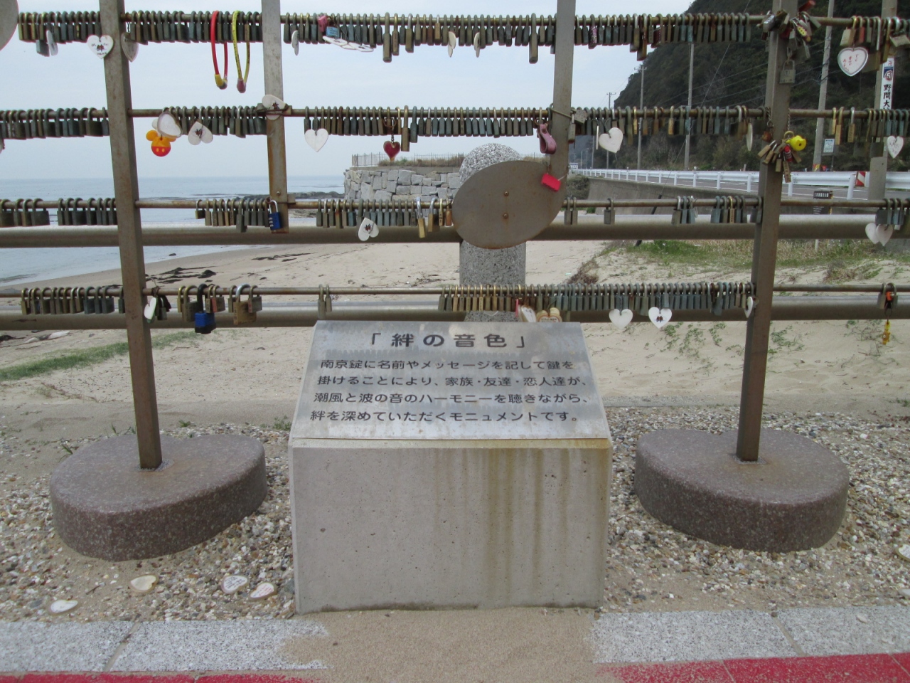 以前来たときには無かったのですが、南京錠がたくさん繋がれていたので、なにかな?と思い立ち寄ってみました。”絆の音色”と書かれてあり、鍵に願い事を書いて、結ぶと願い事が叶うとか・・・。いわゆる、おみくじ結びのようなものですね。家族の絆、恋人の絆などいろんな絆が繋がれていました。