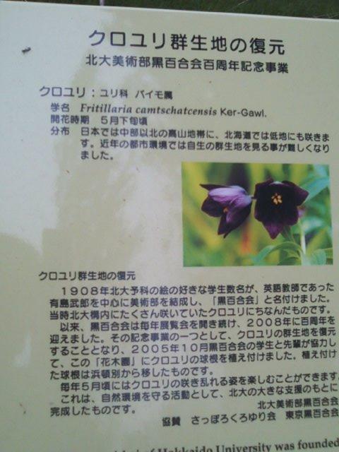 2014年は後に私が住む町にある峠の同名の小説「塩狩峠」を記した三浦綾子が、「氷点」で文壇デビューを果たしてから50周年を迎える節目ということで、色々な展示会やイベントが道内を中心とした各所で開催されていますが、その「氷点」にも登場するのが、北大の絵画サークル「黒百合会」(北大美術部)で、勿論実在するサークル団体です。その黒百合会が百周年の記念事業として、ここに浜頓別から球根を移植してクロユリ群落を誕生させています。私の訪問時は、まだやや時期が早くて蕾の状態でしたが、5月下旬~6月にかけて見頃となるかと思いますので、是非、鑑賞してみて下さい。