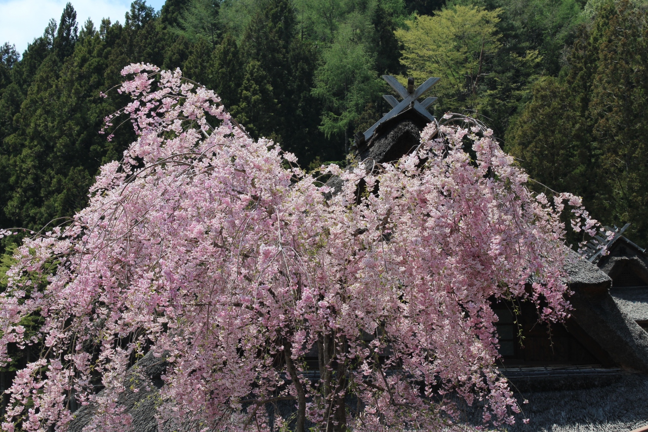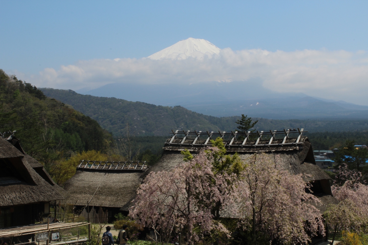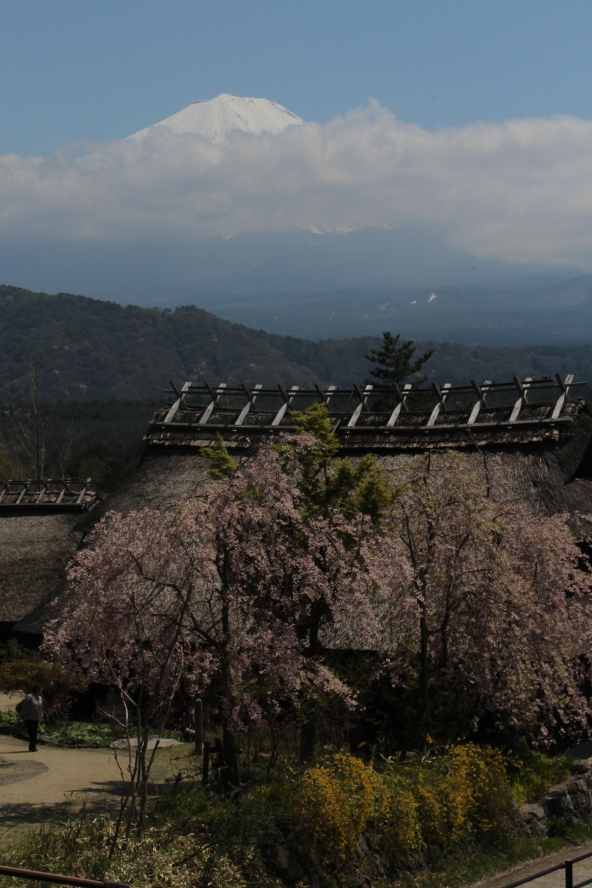 富士山を望む山里の根場地区は台風災害で壊滅的な被害を受け茅葺民家のほとんどが消失したそうです。その後、懐かしい集落を復元して観光地となったそうです。五月の上旬でしたが枝垂桜がまだ咲いていて茅葺屋根の民家とよくマッチしていました。