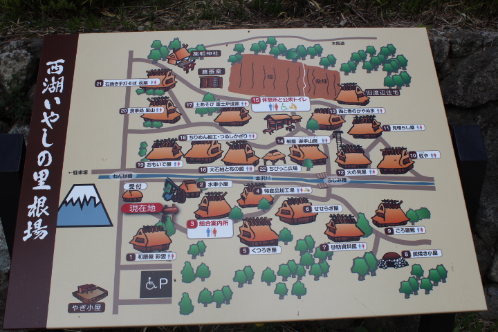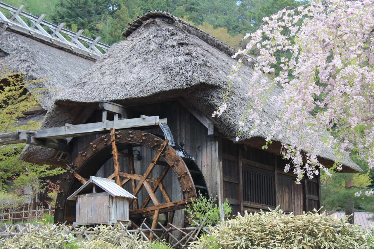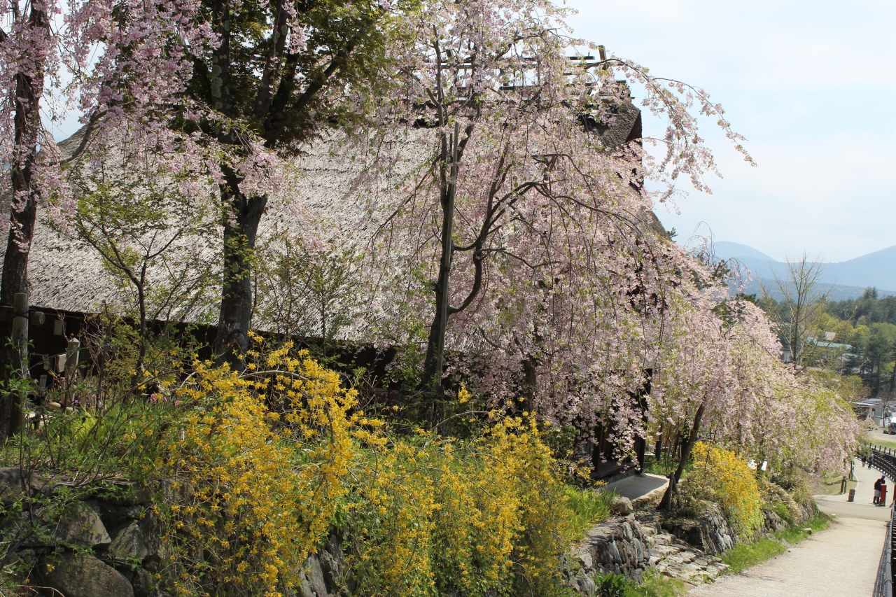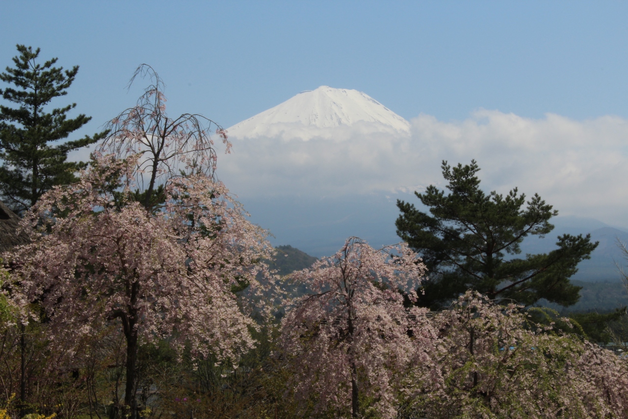 富士山を望む山里の根場地区は台風災害で壊滅的な被害を受け茅葺民家のほとんどが消失したそうです。その後、懐かしい集落を復元して観光地となったそうです。五月の上旬でしたが枝垂桜がまだ咲いていて茅葺屋根の民家とよくマッチしていました。