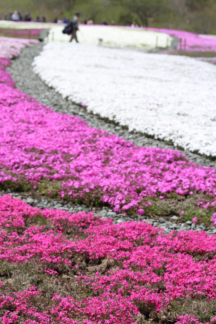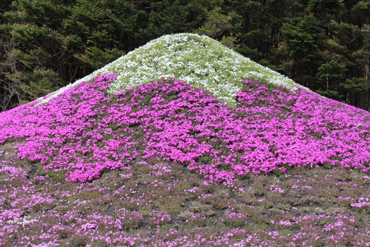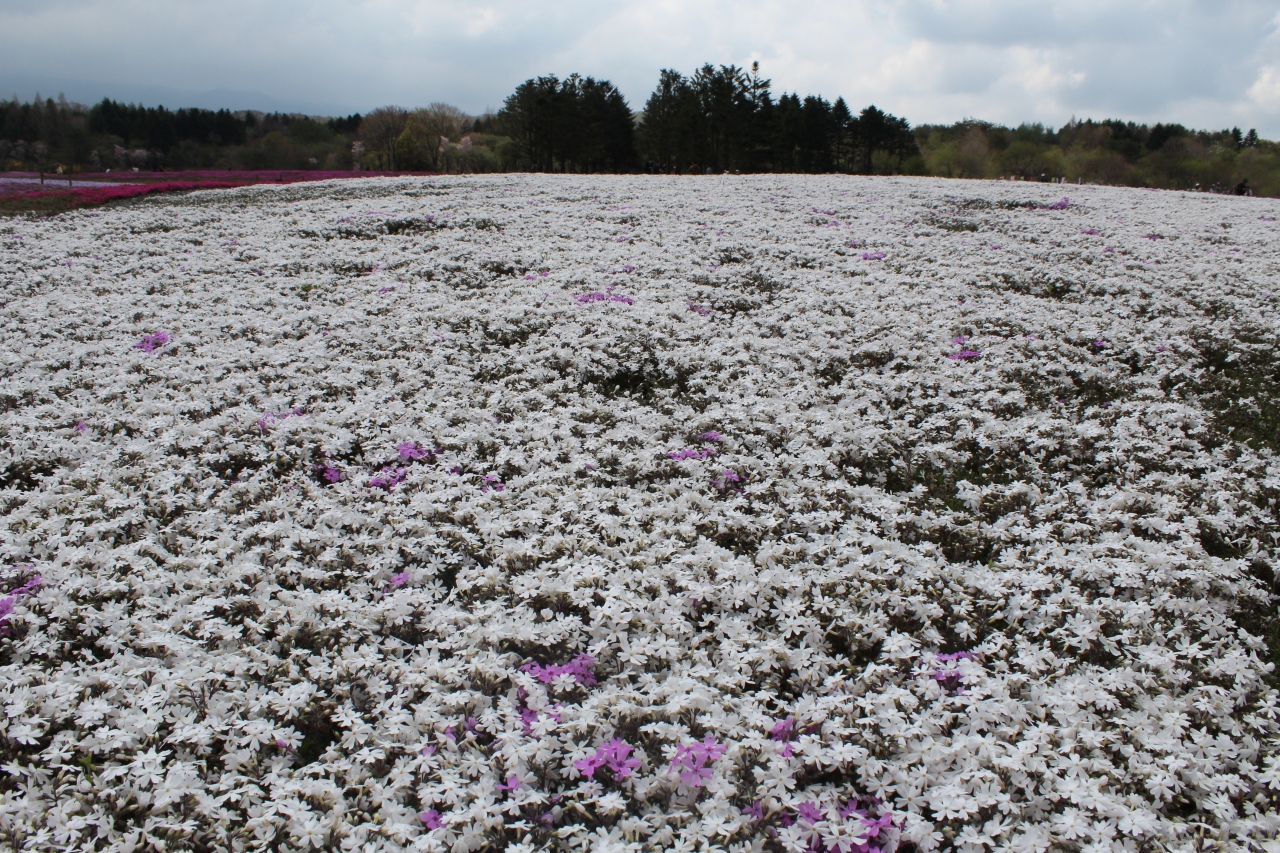 富士山と芝桜の絶景写真を見て行くことにしました。五月上旬で芝桜は四分咲きでしたので翌週が満開だったようです。天気は晴れでしたが、富士山は雲に隠れていてなかなか富士山と芝桜の景色を見ることが出来ませんでした。一瞬富士山の頂だけ雲が流れ、富士山と芝桜のコラボレーションを見ることができました。なかなか満開で快晴の時に訪れるのは難しいですね。富士山が見えない時のためか(世界遺産登録を記念して造ったそうです)、今年からミニ芝桜富士が造られています。会場では「富士宮やきそば」「甲州とりもつ煮」などを食することも出来ます。