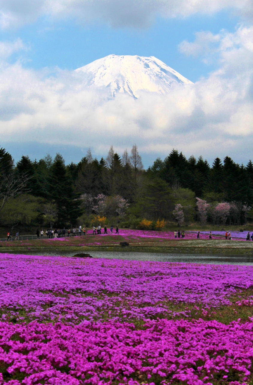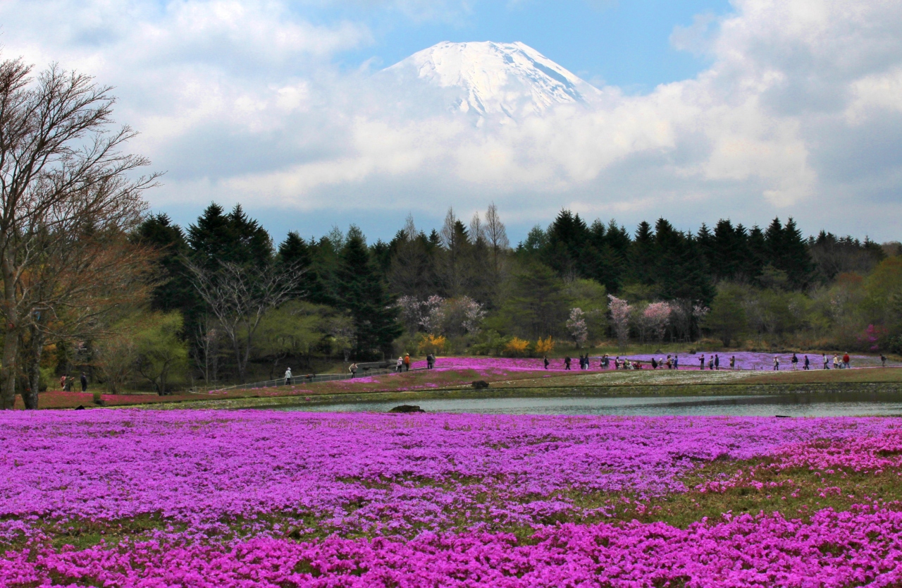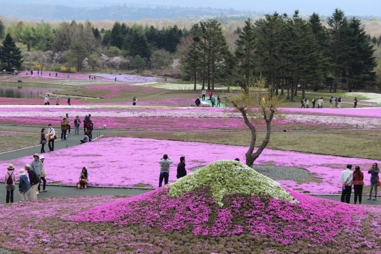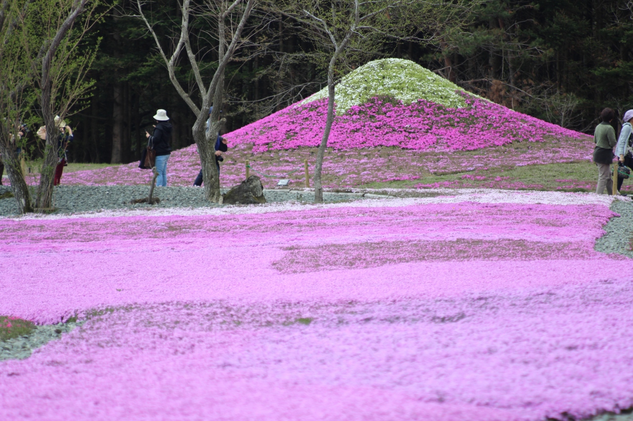 富士山と芝桜の絶景写真を見て行くことにしました。五月上旬で芝桜は四分咲きでしたので翌週が満開だったようです。天気は晴れでしたが、富士山は雲に隠れていてなかなか富士山と芝桜の景色を見ることが出来ませんでした。一瞬富士山の頂だけ雲が流れ、富士山と芝桜のコラボレーションを見ることができました。なかなか満開で快晴の時に訪れるのは難しいですね。富士山が見えない時のためか(世界遺産登録を記念して造ったそうです)、今年からミニ芝桜富士が造られています。会場では「富士宮やきそば」「甲州とりもつ煮」などを食することも出来ます。