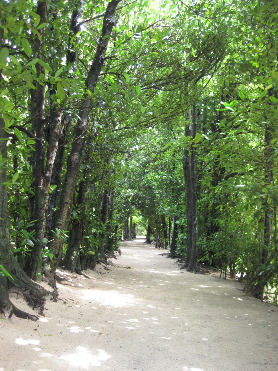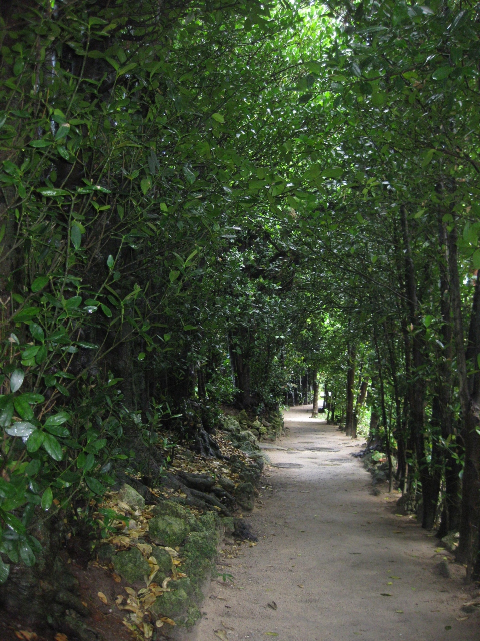 雨上がりに行きました。丁度人も少なく、緑のフクギに囲まれた小道を歩くと、気持ちも新鮮、和やかな気がしました。この小道は地域の生活道路そのもので、非常に自然な感じがし、昔の沖縄という雰囲気がします。白い砂道、緑のフクギ、何か贅沢な気がします。横道をそれますと、きれいな海岸にすぐ出ます。少し歩いたらこの海岸でゆったり休憩、そしてまた歩く、非常に贅沢な時間を過ごせますよ。