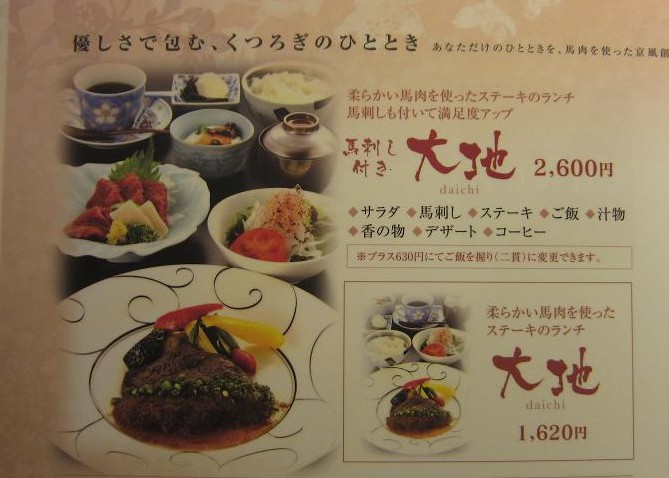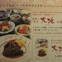 ランチコースがあったので、その中から「馬刺し付き大地」を選びました。馬刺し・馬肉ステーキにサラダ・ごはん・漬物・味噌汁・デザート・飲み物がついて2600円でした。ランチにしては少し値が張りますが、念願の馬肉料理を2品も食べる事ができ満足でした。
