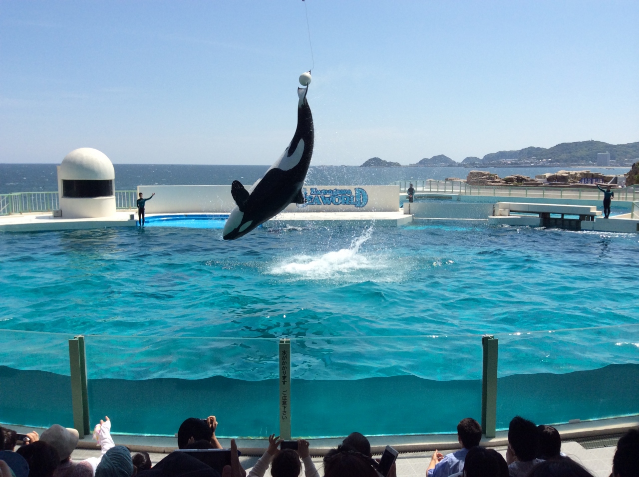 特にシャチは、その身体の大きさから、ジャンプの迫力満点。前方に座るとみなびしょ濡れになるぐらい。