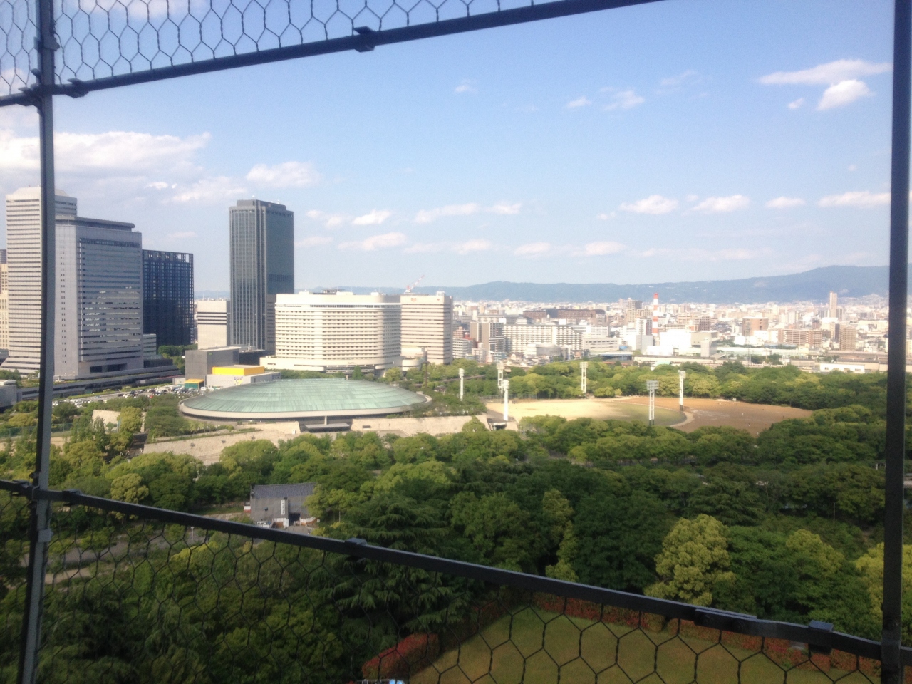 大阪城の天守閣から公園の緑や大阪城ホールを上から見ることができ、通天閣、あべのハルカスも見えました。