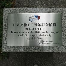 横浜開港資料館に隣接する開港広場の一角に「日米交流150周年記念植樹2004年4月3日」と書かれた記念碑があります。日米交流150周年記念式典が2004年4月3日にこの場所(開港広場)で行われ、その際にタフト大統領の曾孫であるボブタフトオハイオ州知事から送られたハナミズキがここに記念植樹されたようです。広場内には、「日米和親条約締結の地」の記念碑や「日米和親條約調印の地」と刻まれた球形の石碑があり、ここから日本とアメリカの交流がスタートしたことが伺えます。横浜散策の際には寄って見たい、横浜や日本の歴史を感じられるスポットです。広場では、その他、「旧居留地90番地の大砲」や「時計塔」、「明治10年代に築造されたレンガ造りマンホールと下水管」なども見ることができます。
