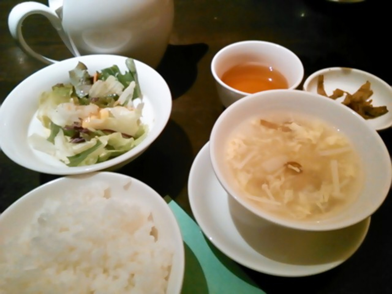 サラダ・スープ・本日の一品(イタヤ貝の炒めもの)・メインのお料理(エビマヨをチョイス)・ごはん・おつけもの・本日のデザート(チョコプリン)で1030円!大満足です。