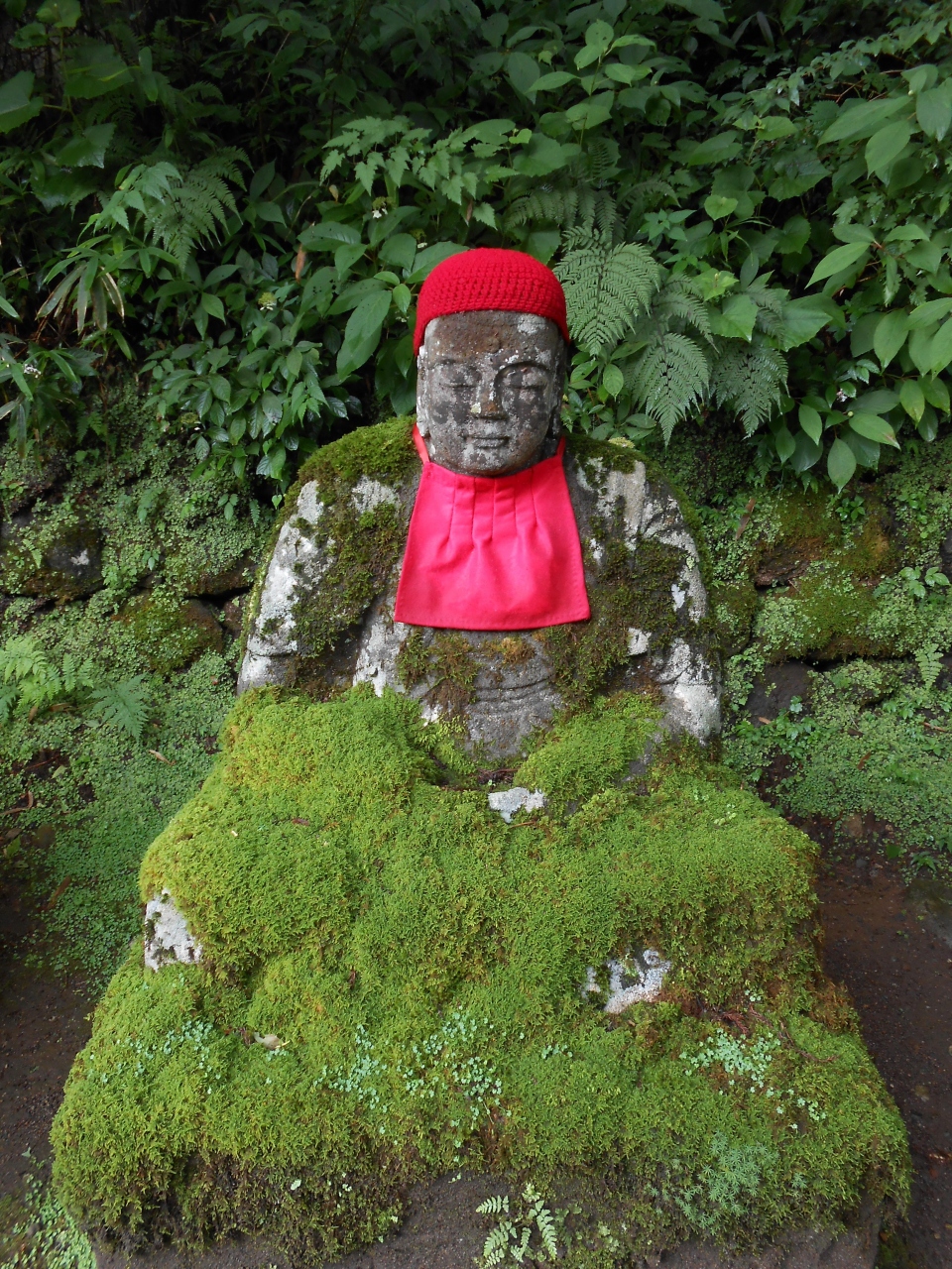 緑の中にお地蔵様の赤が映えてる。お一人お一人表情が違うのも面白い。