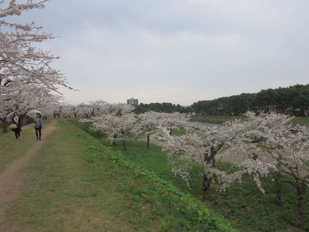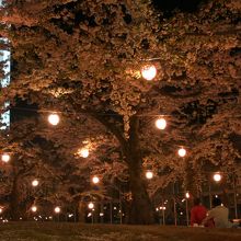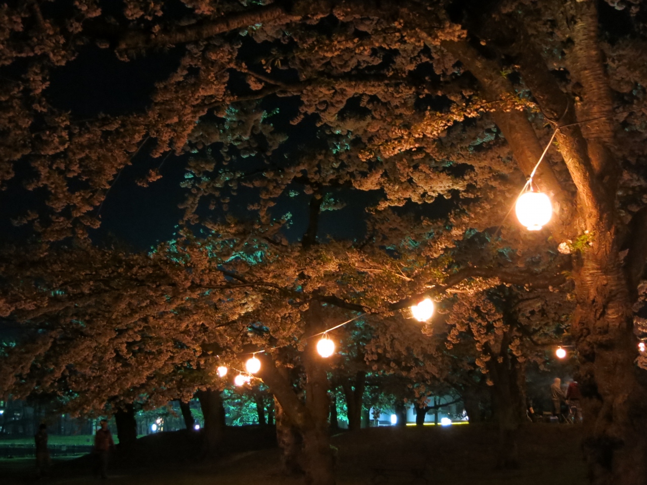 訪れた時は、桜は満開で、寒くもなく天候も良かったのですが、日曜の夜に訪れたせいか、地面に敷かれたブルーシートはがらがらの状態でした。皆、函館山の夜景を見に行っているのでしょうか? しかしそれでも、ところどころから焼き肉の香りが漂ってきたり、歓声があがったりしていました。なお、酒宴を催している人たちよりも、歩きながら夜桜を楽しんでいる人の方が多かったです。また、公園内に露店などは出ていませんでした。