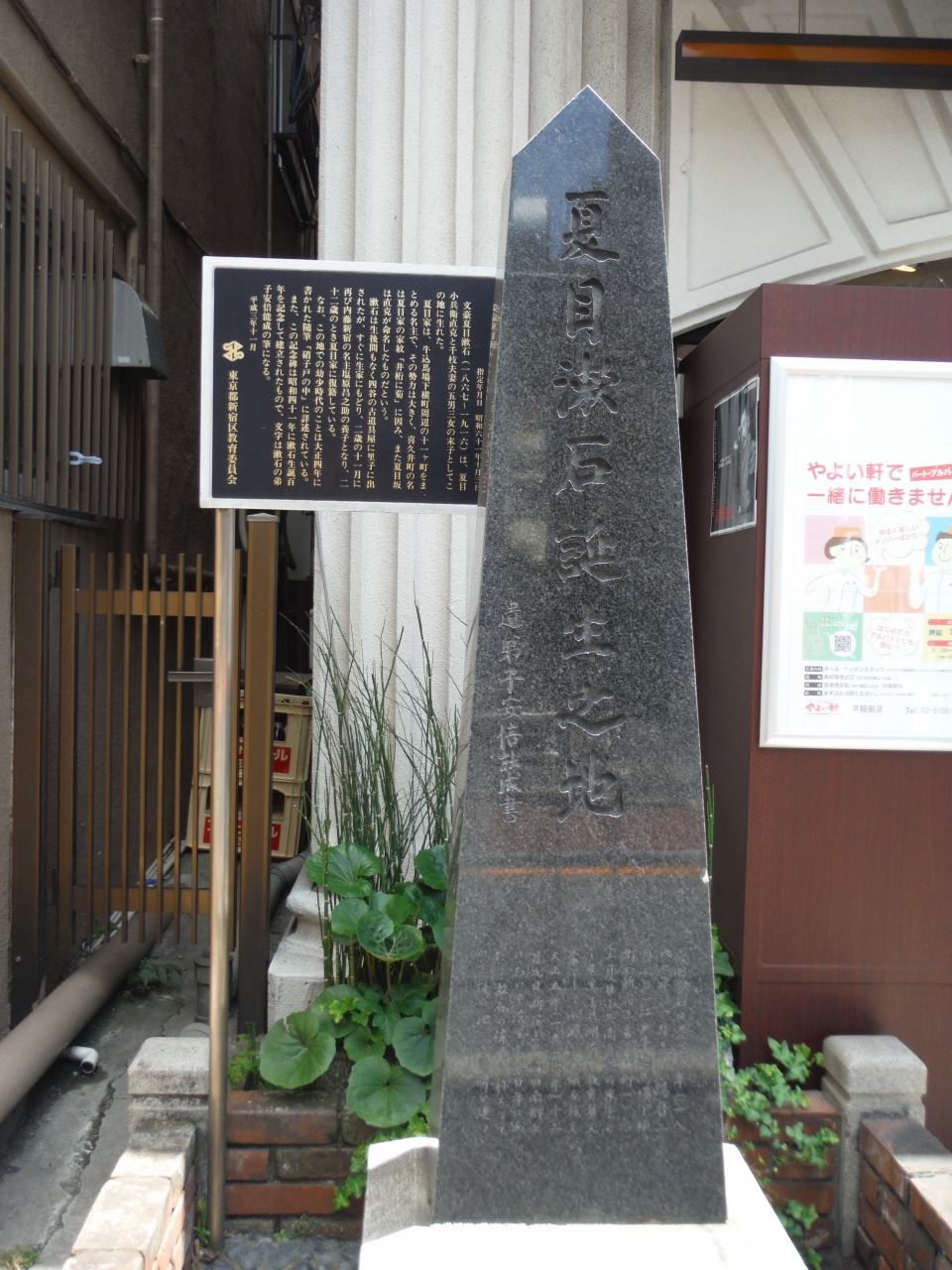 夏目坂のはじまり辺りにやよい軒というファミレスがあり、その前に「夏目漱石誕生の地」碑が建っています。昭和41年に漱石生誕100年を記念して建てられました。