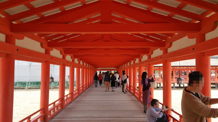 5月初旬の11時頃、干潮に近い状態で少し砂浜を歩けました。満潮と言われる14時前後にも残念ながら十分な水位はなかったので厳島神社の床すれすれのところまで海水がある状態は見ることができませんでした。