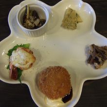 前菜のオードブルは五角の可愛いお皿に盛られたわらびやコロッケが目でも楽しめました。