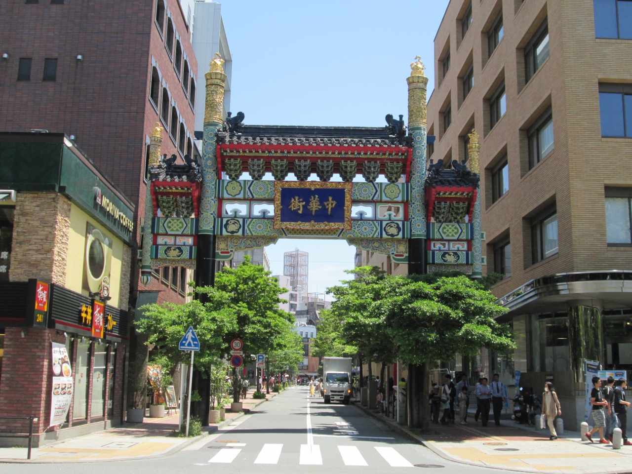 日本大通りに面している中華街の門。シンボルカラーは黒です。中華街の門のうち一番北にある門で、守護神は水の神です。亀に蛇が巻き付いた姿を表わしており、子孫の繁栄を象徴してます。すぐ近くには横浜公園、横浜スタジアムがあります。