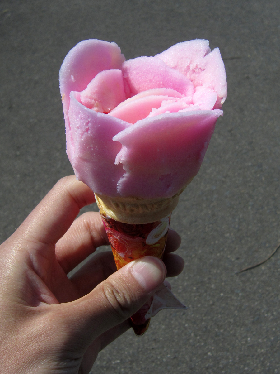 ピンクと黄色のアイスをバラのように花型にしてくれます。シャーベットにも似た食感度アイスです。