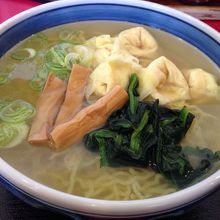 11:30の開店と同時に5組が入店しその後も続々と来客のある人気店でした。掲示ポスターによるとみそラーメンが一番人気だそうです。塩味を食べたい気分で注文した海老ワンタン麺は身のしっかりした5個のワンタンが乗って食べ応えがありました。