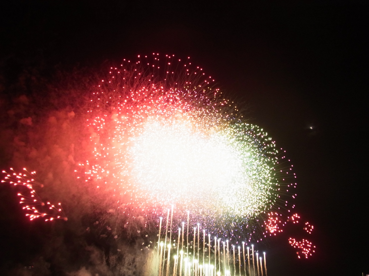 土手から見ると花火が降ってくるように感じられてすごい迫力でした。