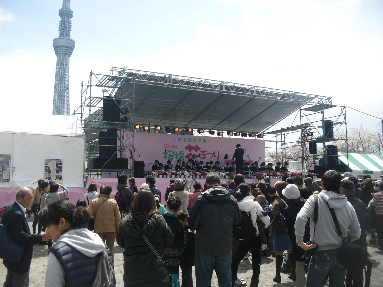 ここ隅田公園は隅田川沿いにあり春になると桜が咲き誇ることで有名です。隅田公園の浅草側の広場では毎年桜橋花祭りが開かれます。たくさんお出店やステージなども作られ盛大に開かれていました。また近くには歩行者専用の桜橋という橋もかけられており隅田川両岸の桜を楽しめるようになっていますよ