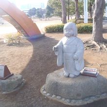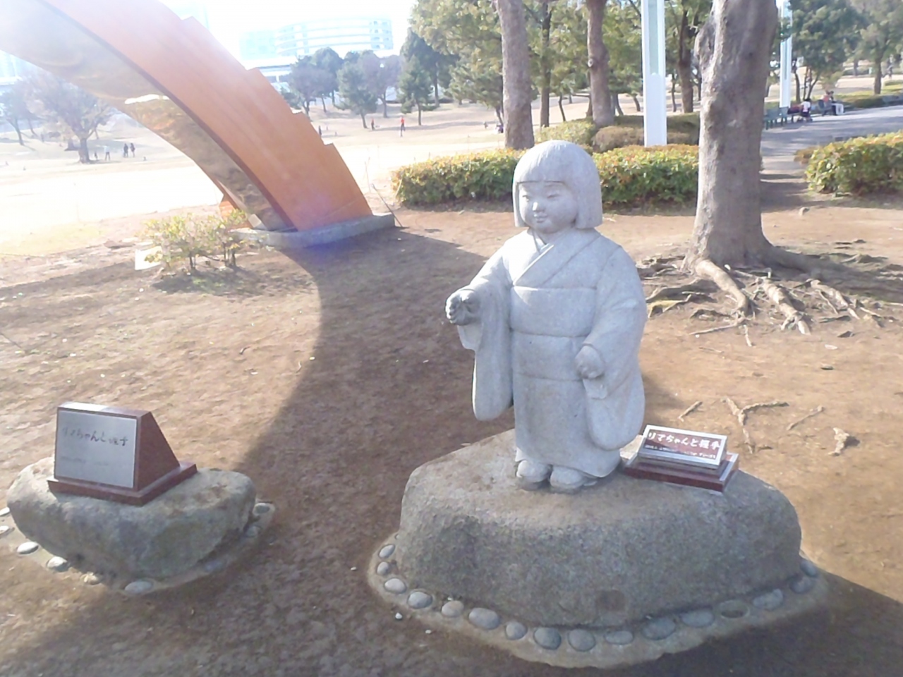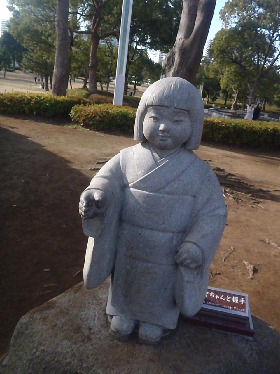 可愛いおかっぱの女の子の石像でリマちゃんと握手!HOLA AMIGOS!こんにちはアミーゴスと書かれています。