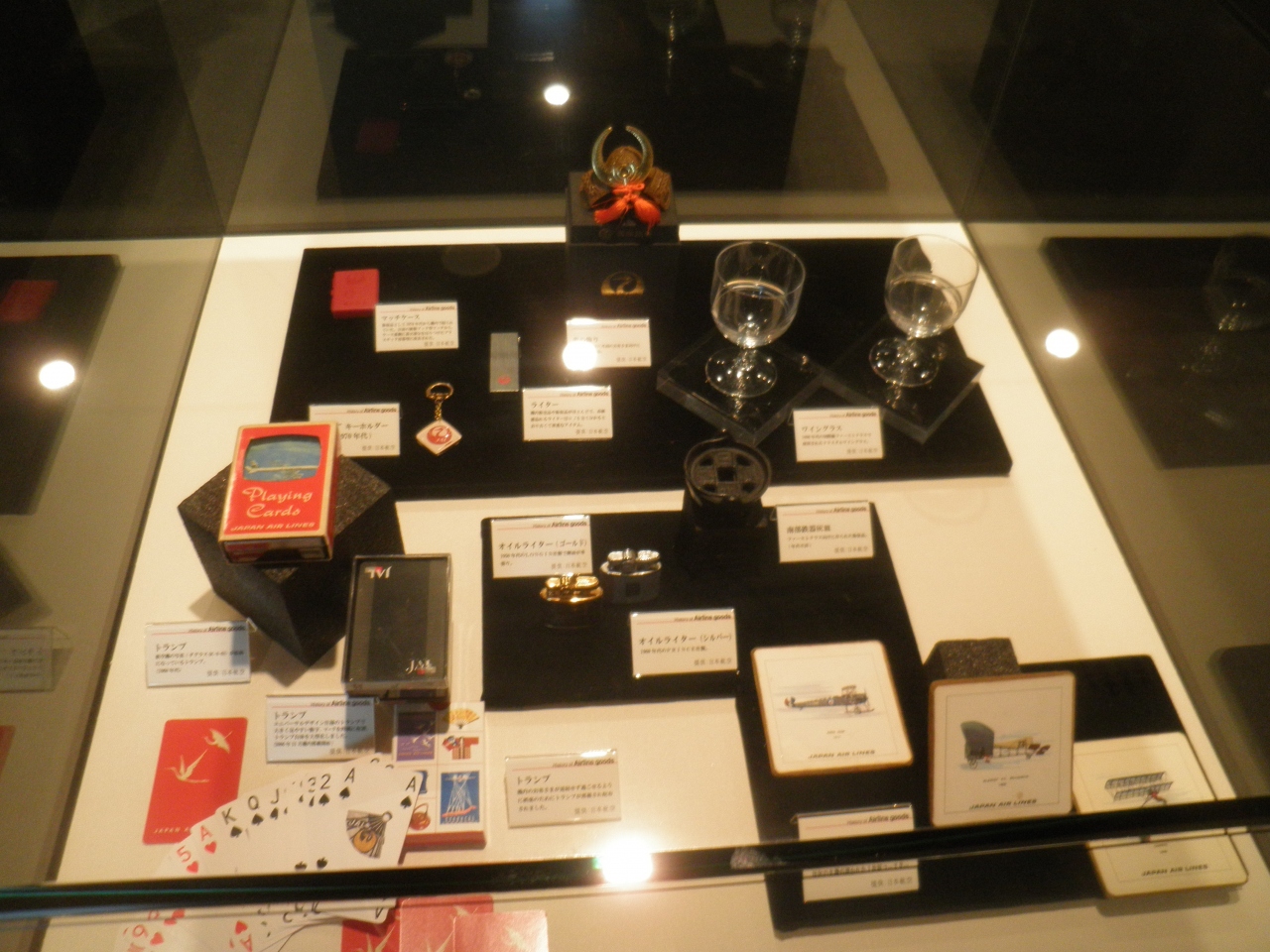新千歳国際空港の3階のフードコートのそばにあるエアポート ヒストリー ミュージアム を訪れました。 ちょっと照明を抑えた感じのおしゃれな展示空間です。 飛行機に関係した用品が展示されており、キーホルダー、ライター、灰皿、トランプ、ワイングラスなど楽しい感じです。