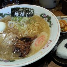ラーメン競合店がひしめく商店街にある店で昼時はよく行列ができている。麺大盛りは無料のサービス、でっかい丼がドーン!とやってくる。これにランチタイムはおにぎり2個or白ご飯がサービスでつく、普通の女性ならギブする量である。