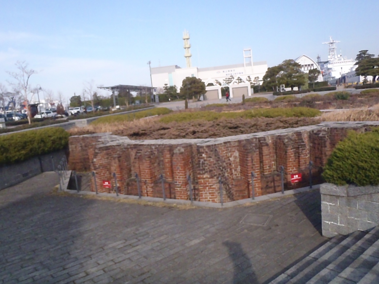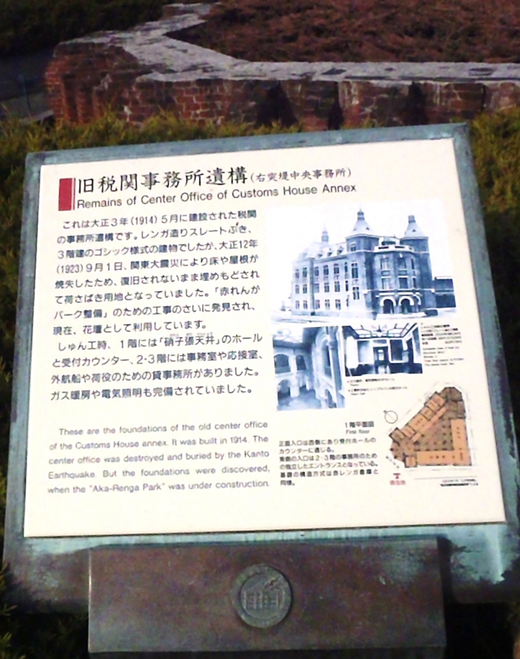 掲示板によれば大正3年5月にレンガ造りスレートぶきで建てられたが、大正12年9月関東大震災で消失、復旧されないまま埋め戻されていたが赤レンガパーク建設中に発見され現在は花壇として利用しているそうです。