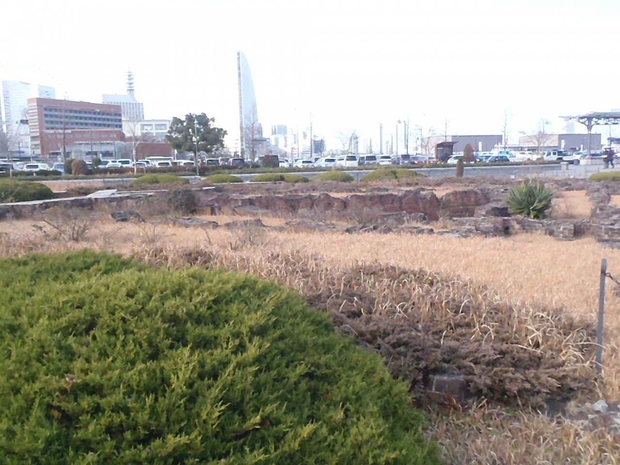 みなとみらい線馬車道駅から約1km徒歩で大体15分、万国橋通りを運河パーク方面から赤レンガ倉庫パークの敷地内、レンガ建て倉庫の奥のほうレンガ造りの花壇のように見える所が旧税関事務所遺構です。