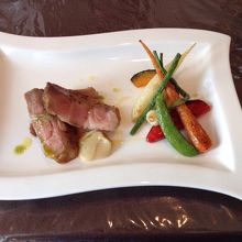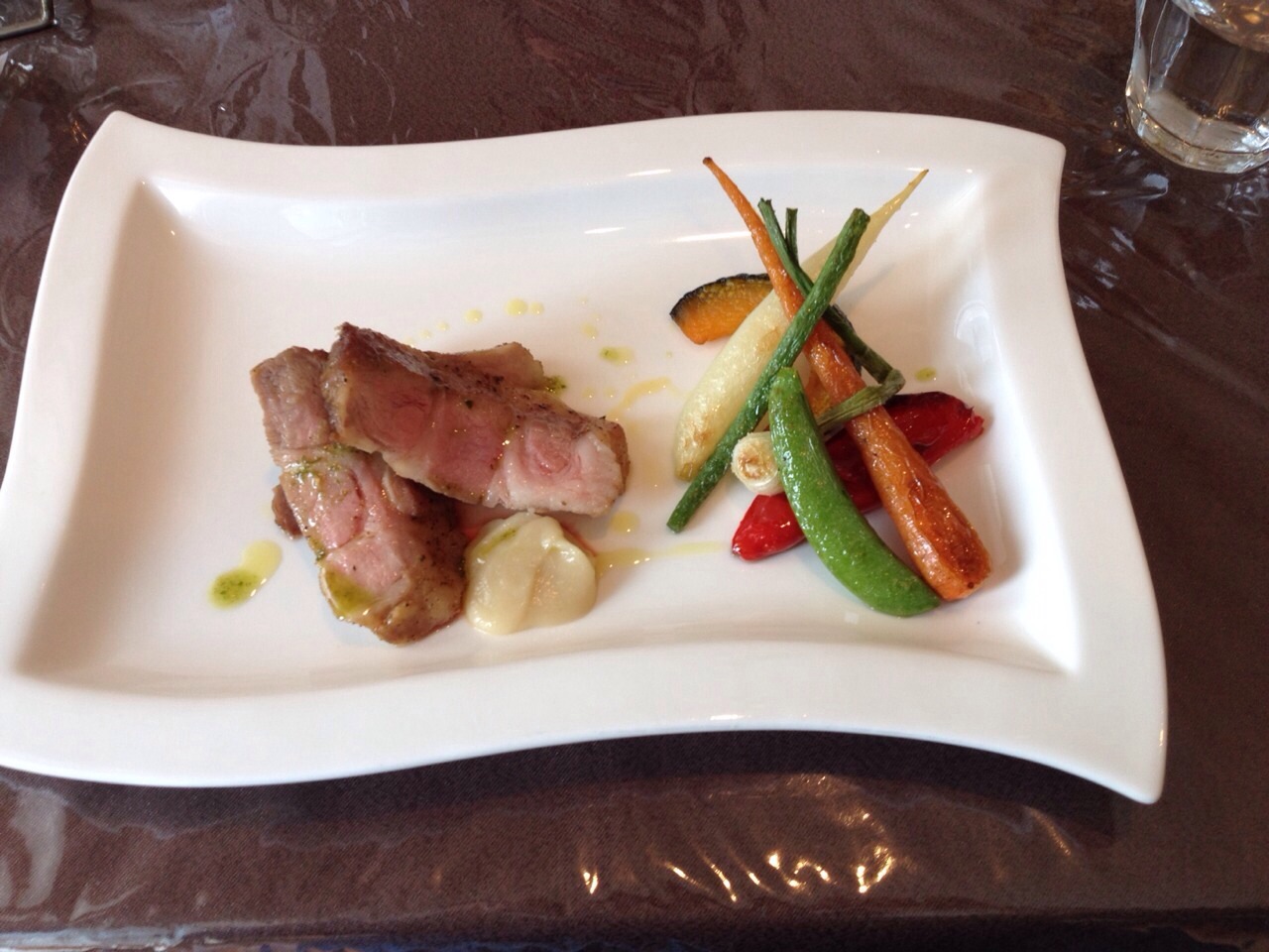 この時点でお腹が少しずついっぱいに。メインは国産のローストポーク。脂の甘みも感じるのにくどくなくさっぱりしています。色とりどりの野菜も素敵でした。