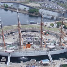 上から見下ろすと、なだらかな緑地(横浜みなと博物館の屋上)が美しいウオーターフロントです。