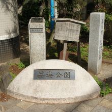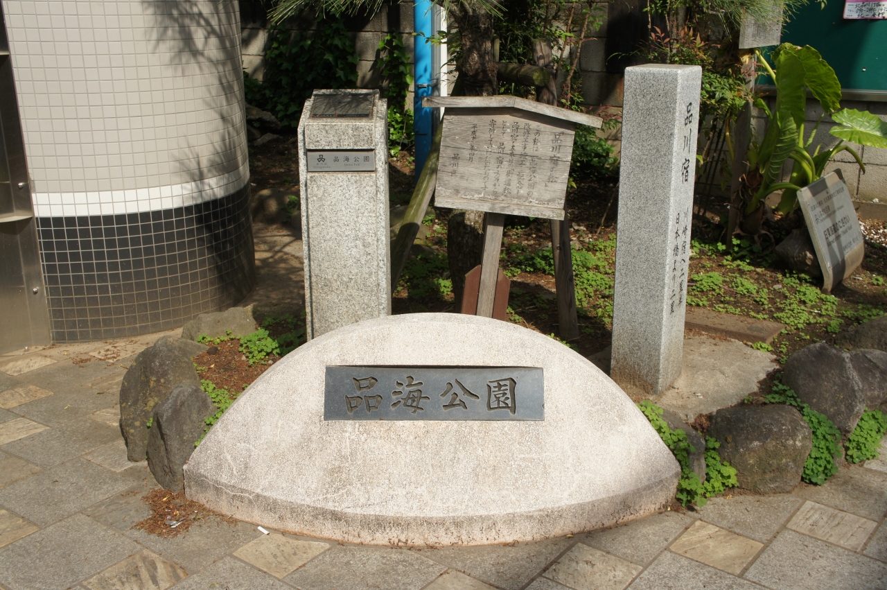 品海公園は、北品川商店街の一角。旧東海道品川宿の中ほどに残る小さな公園です。入口には、「日本橋から二里」の道標と街道松「品川宿の松」がありました。道標は品川宿のシンボルとして建てられたもの。二里は、約8キロにあたります。
