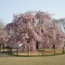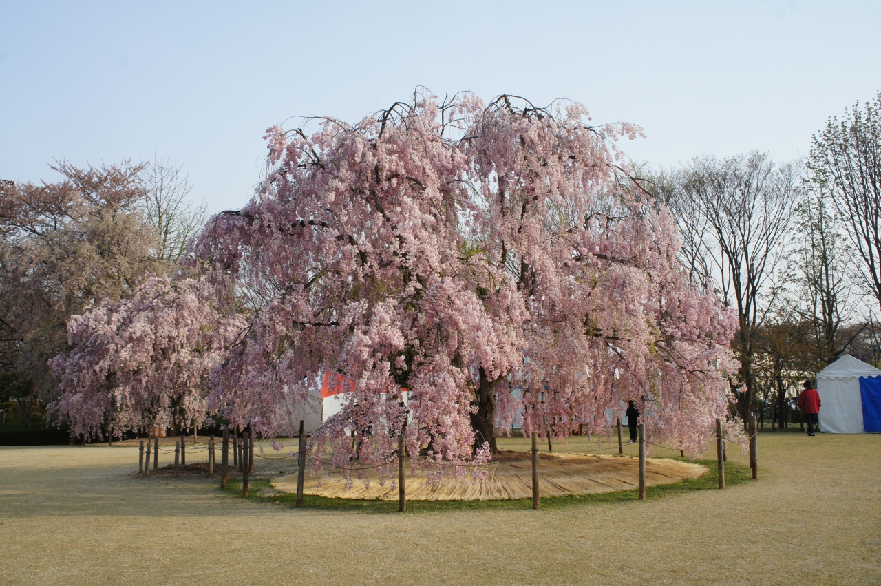 霞城観桜会は、ゴールデンウイークの前半。もうこんな時期だとほとんどの桜は終わっているんですが、最上義光像のある広場には紅しだれ桜の大木が二本ありまして、これがまさに満開。ここが会場になっているので、ちょうどいい感じです。霞城を埋め尽くす桜を想像していた人には少しさみしいかもしれませんが、このエリアだけとれば雰囲気は最高です。