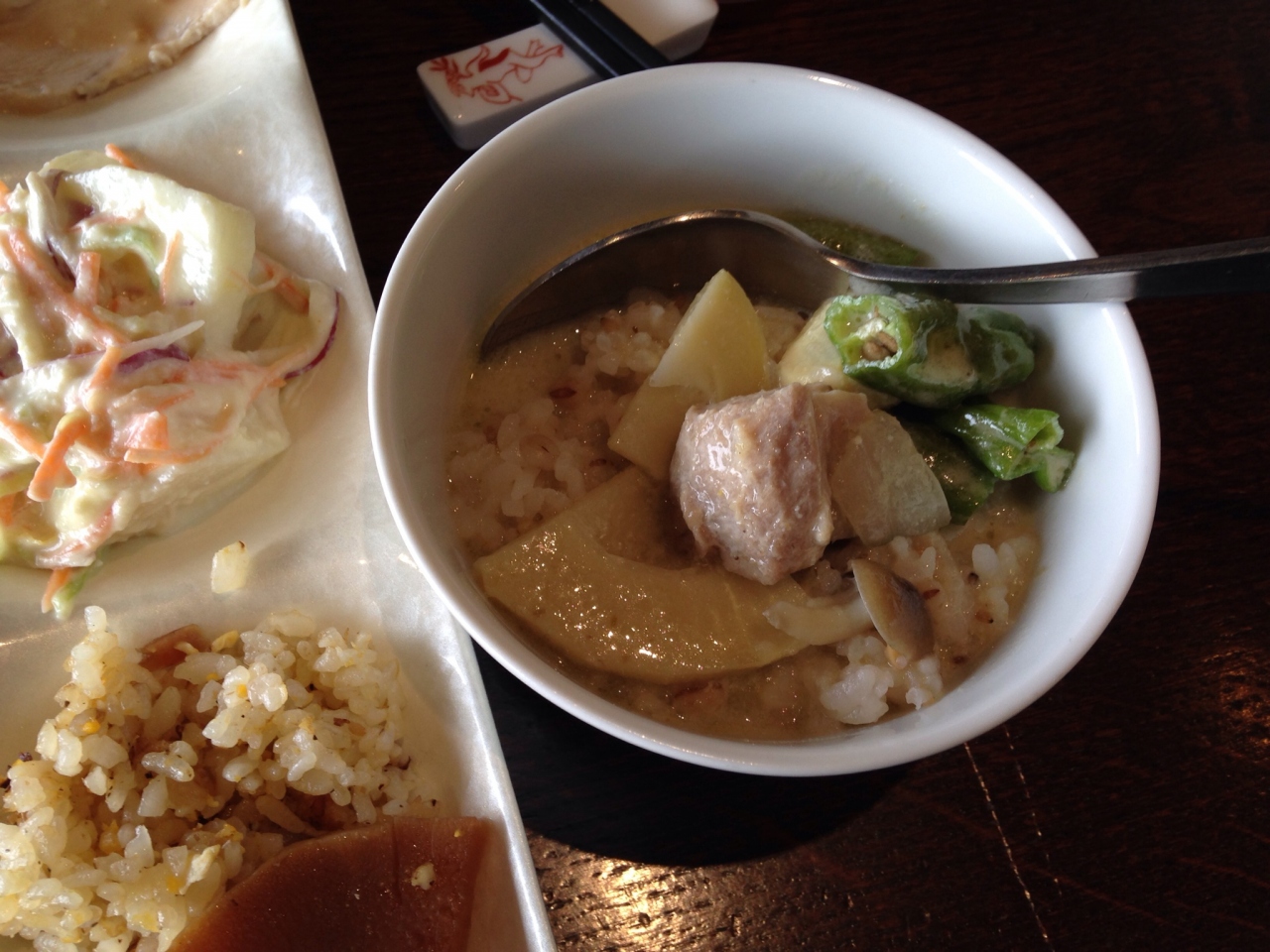 用意されている9つに区切られたお皿に山のようにおかずを盛りつけて、それをモウ一度お代わりしてからさらにタイカレーを別に盛り付けて食べました…。チキン、豚肉、旬の野菜などの煮物、揚げ物、炒めものなど色々あります。牛肉のおかずは無かったなぁ。