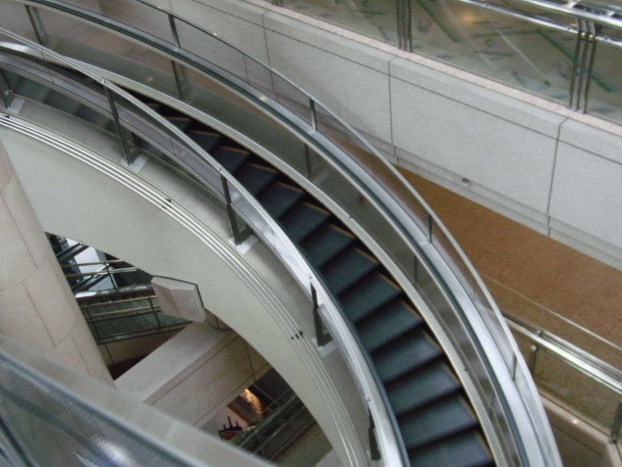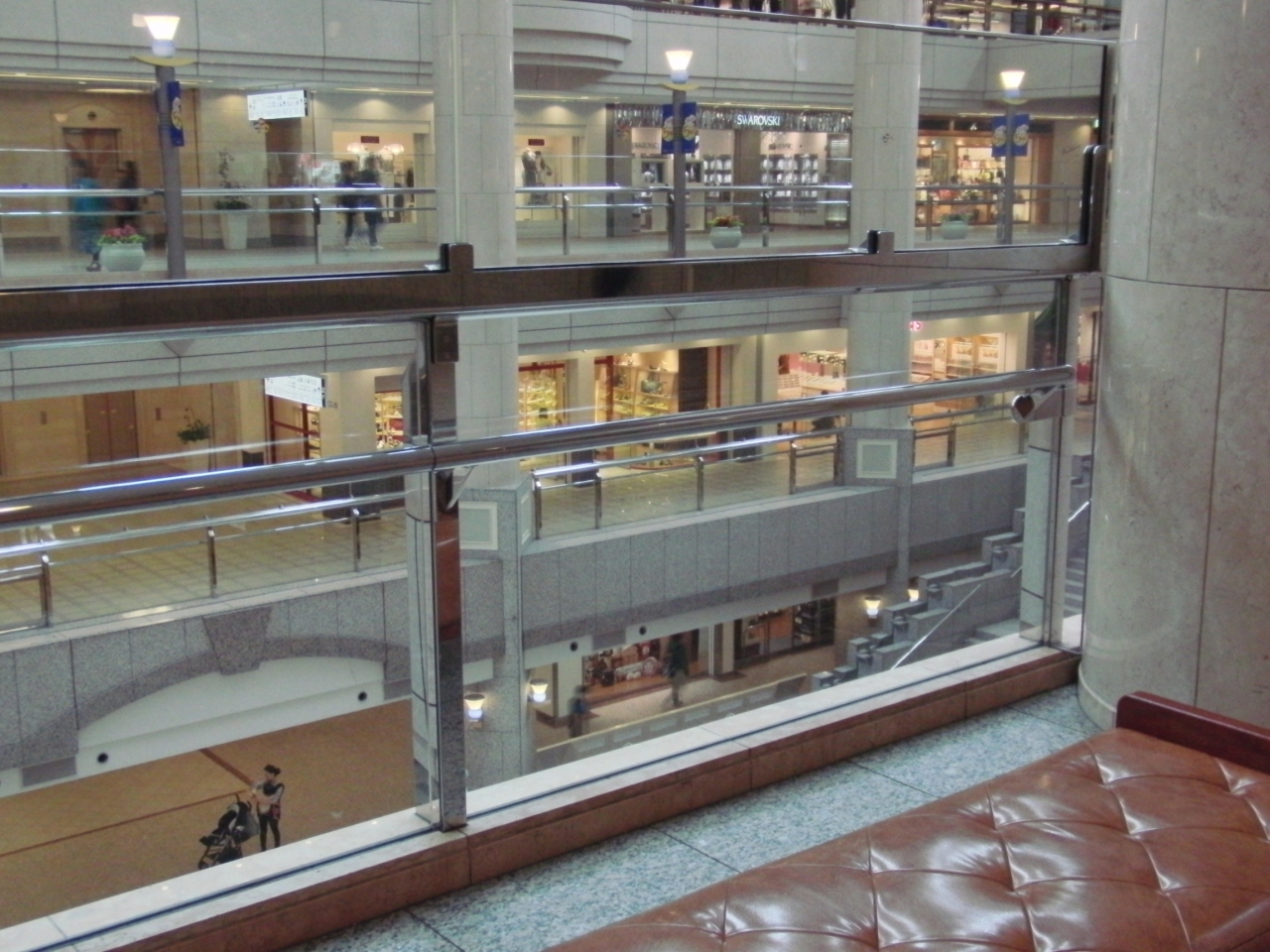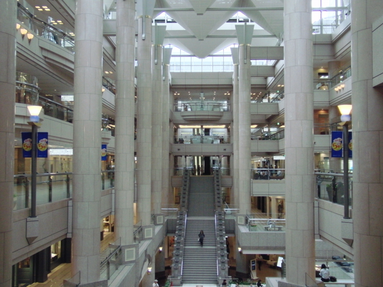 3階から1階に繋がる階段脇に水の流れがあり、天井から自然の光が差し込み、雀がまぎれていたり、明るい雰囲気のショッピングモールです。