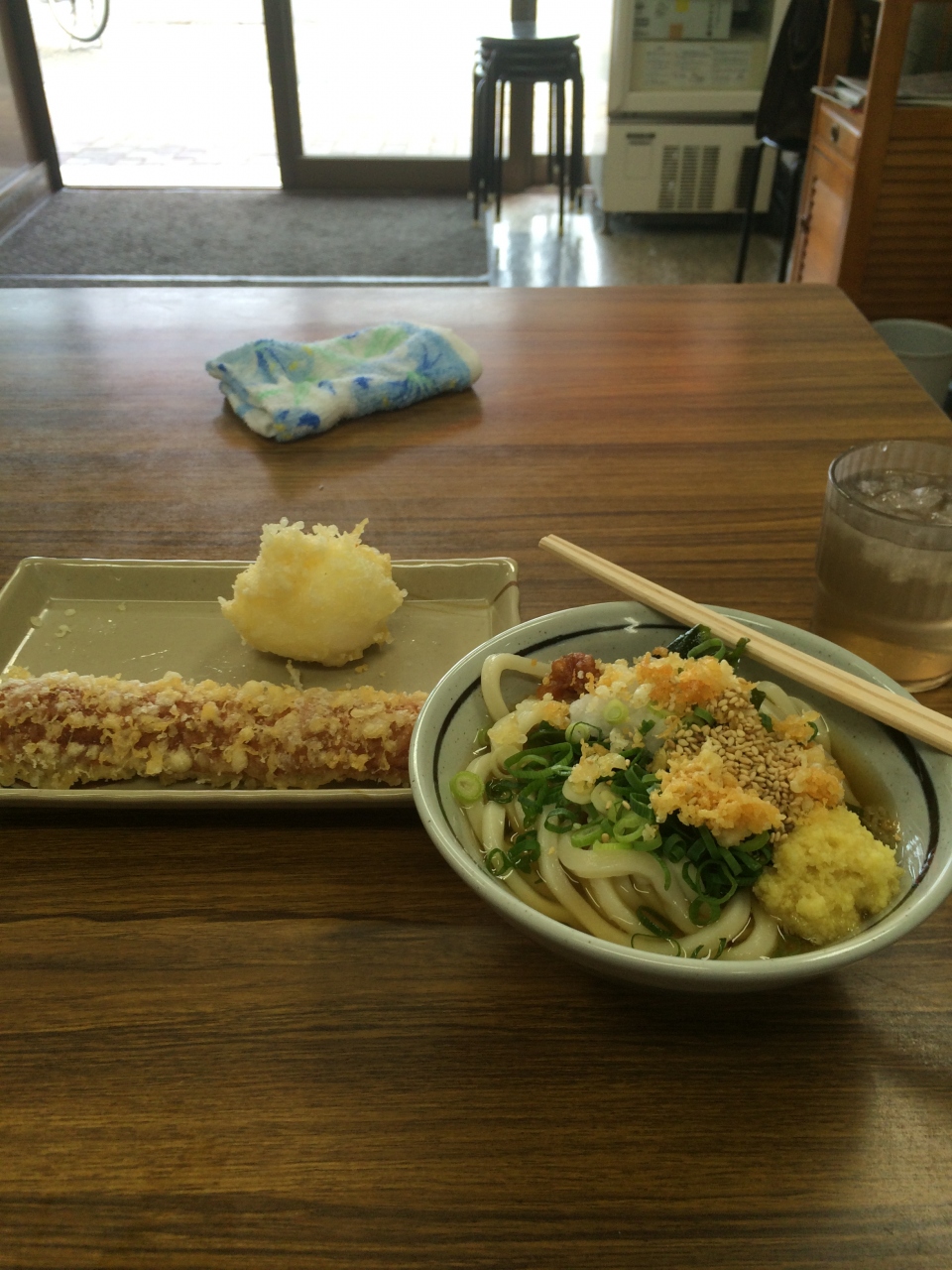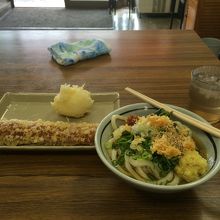 高松駅からレンタサイクルで10分くらいでした。11時くらいに到着すると、てんぷら揚げたてで、卵が半熟のてんぷらと竹輪のてんぷらとぶっかけうどんを食べました。だしが薄い感じがしました。うどんにはこしがあり、おいしかったです。