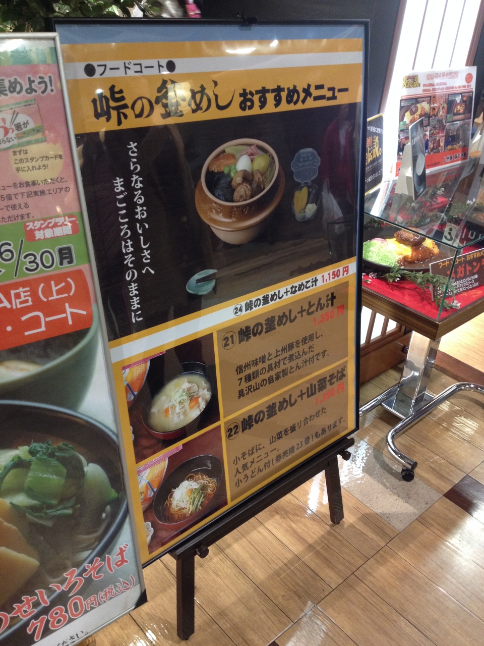 日曜の夜、事故渋滞で高速が混んでいたのでこちらのパーキングエリアで遅い夕食をとりました。こちらは、釜飯で有名とのことですが、夜9時には売り切れていて食べることができないので要注意です。しかし、通常のフードコートのお店はどこもオープンしていたので、問題なく食べることができました。建物内に電車のオブジェ(本物)がある、とても珍しいサービスエリアでした。