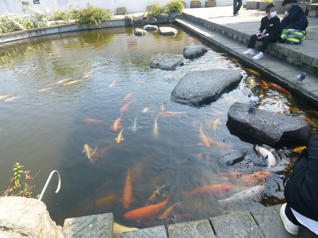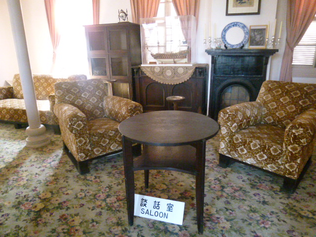人気の観光スポットグラバー園の観光は、今回「グラバースカイロード」で上部の入口から入り下って行くコースにしました。そうすると、まずはここ「旧三菱第2ドックハウス」からのスタートです。観光案内所となっていて見学の良いスタートです。また建物の前には鯉が泳いでいる池があります。