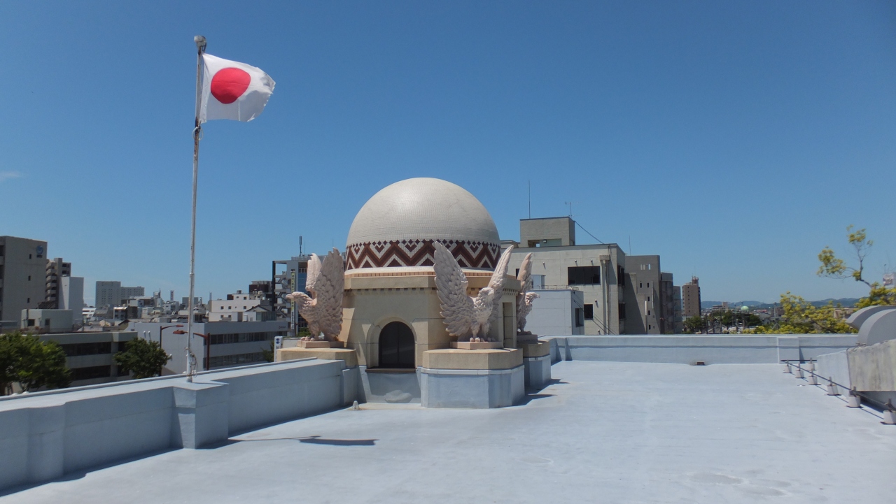 この豊橋市公会堂は、豊橋市役所の南側にあって、市街電車の市役所前から徒歩数分です。催し物などがないときには、1階の事務所でお願いすれば、館内の見学をさせてくれます。私もお願いして内部や屋上まで見学させていただきましたので、屋上の写真をアップしておきます。