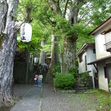 こじんまりとした鳥居をくぐると、そびえる杉の木々に迎えられます。石段を登ると左手に「夫婦杉」が見えます。