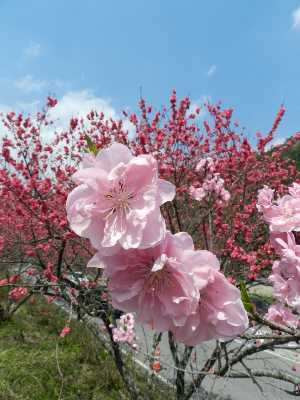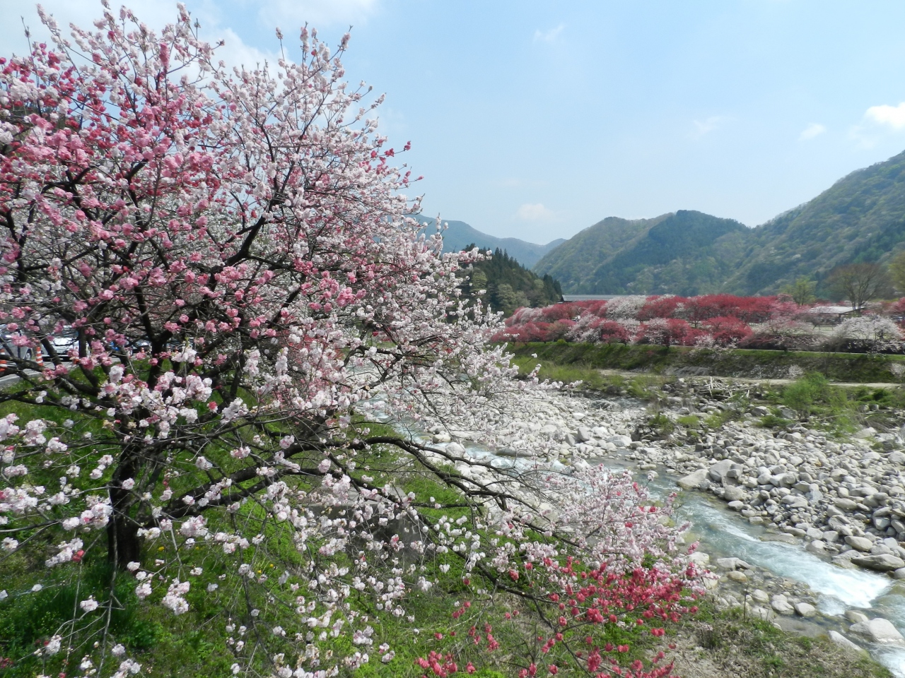 『花桃の里』の中心は月川温泉辺りにあって、渓流沿いに無数のハナモモの木が植えられて、赤・白・ピンクの花が咲き誇っています。