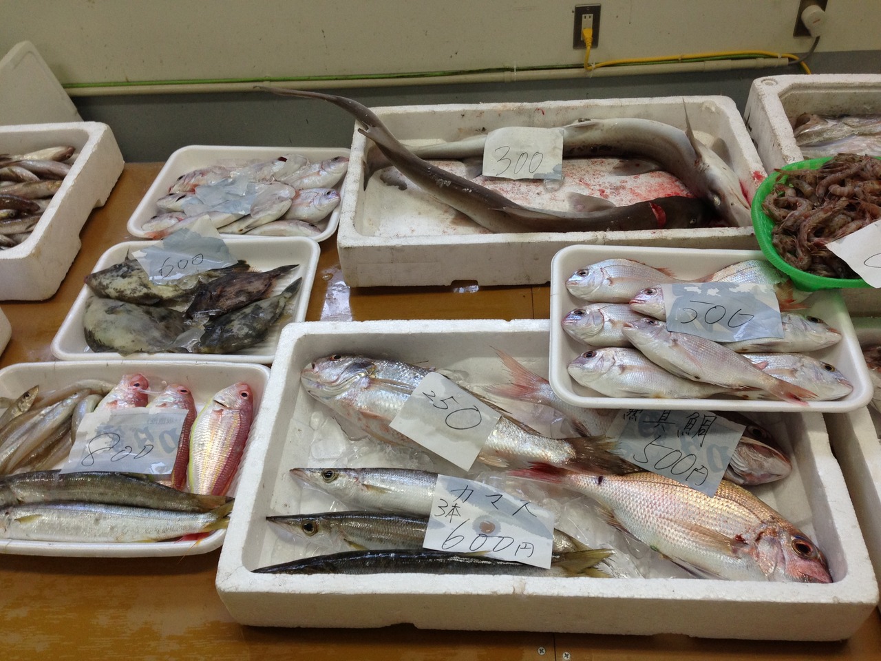 和歌山市の南にある、ここ和歌の浦は、しらすで有名。漁港近くには、10時から14時まで開催している市場もあり、観光客や釣り客で賑わっています。中で売っている魚は、写真のような感じ。決して安くはありません。