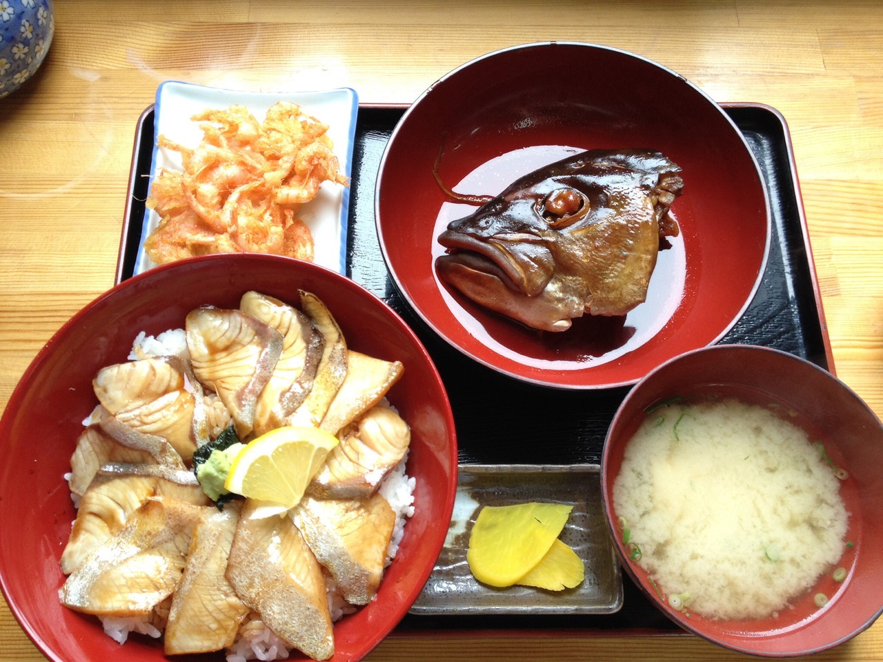 メインとなる丼ものは炙りカンパチ丼と漬けカンパチ丼しかありませんが、どちらもとても美味しいです。特に炙りカンパチは脂ののったカンパチの刺身が表面だけ炙られており、程よいレア感が出ています。あと付け合わせ(?)のカンパチの頭の切り落としも初めて食べましたが、意外と可食部が多くてビックリ。リピート決定です!
