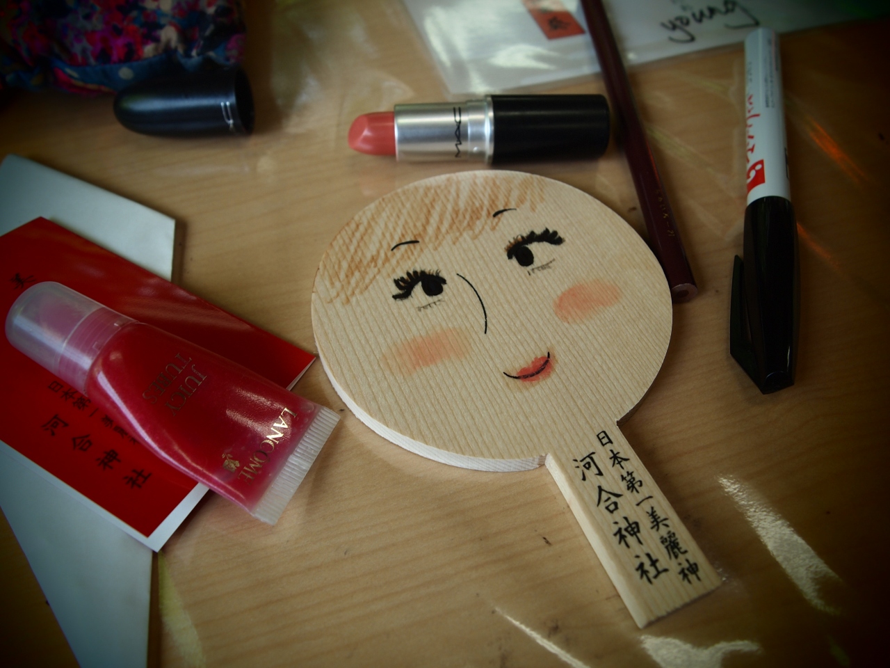 顔の書かれた絵馬にお化粧するというめずらしい参拝方法は女の子同士で訪れたら更に楽しいものになりそうです。ポーチにリップとチークしか入っていませんでしたので、ここに来るならメイク道具を入れておけばかった!と思いました。備え付けてある色鉛筆やサインペンでお化粧することも可能です。