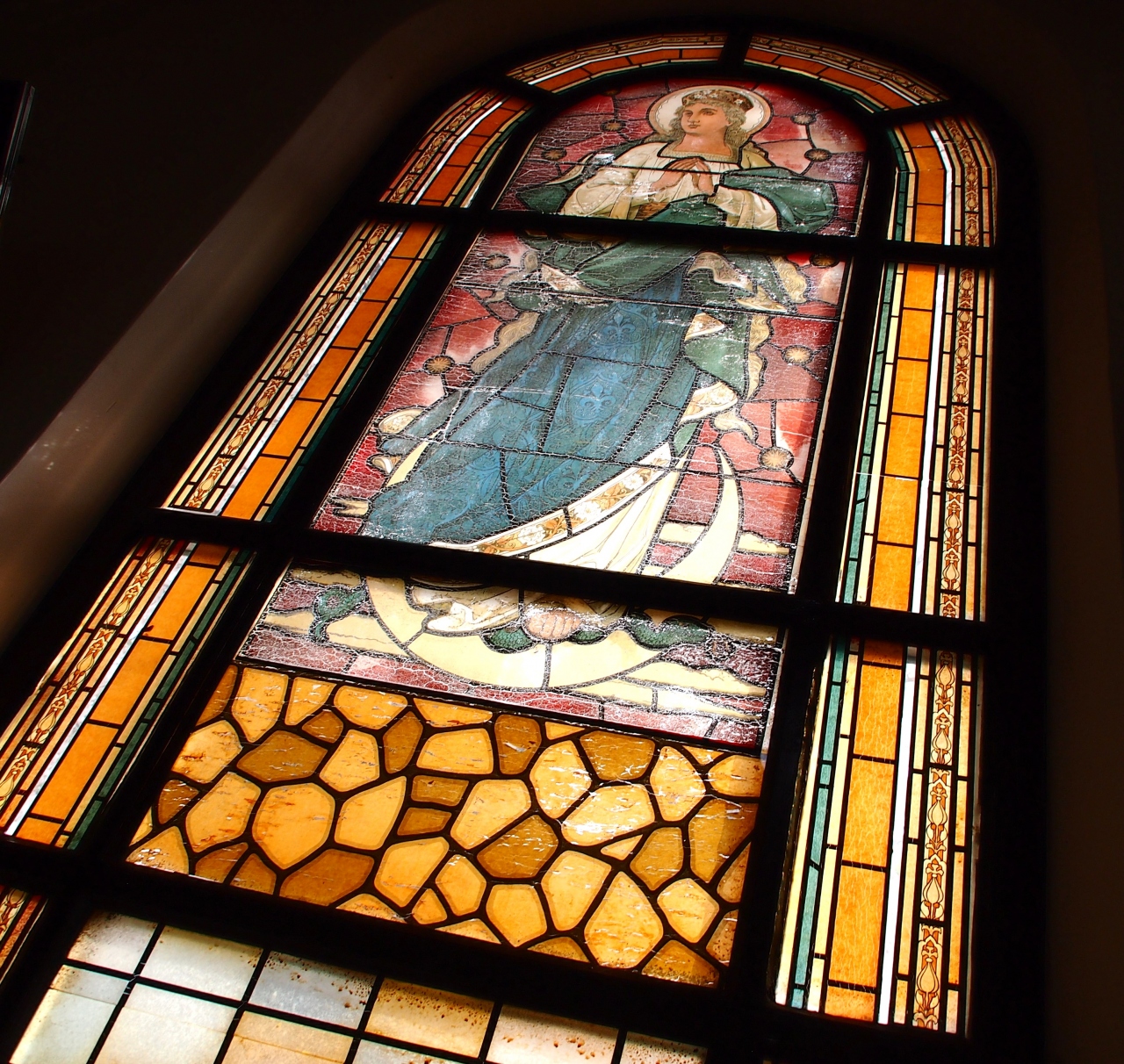 またステンドグラスではなく、「貼り絵」と呼ばれる手法の窓絵も見どころ。薄い透明な紙に描かれた聖画を外側から貼り、さらにその外側にガラスを設け、二枚のガラスで挟んだものです。高価なステンドグラスに代えて使用したと考えられますが、現在、この種の窓絵は、日本においてはこの教会でしかみることができません。