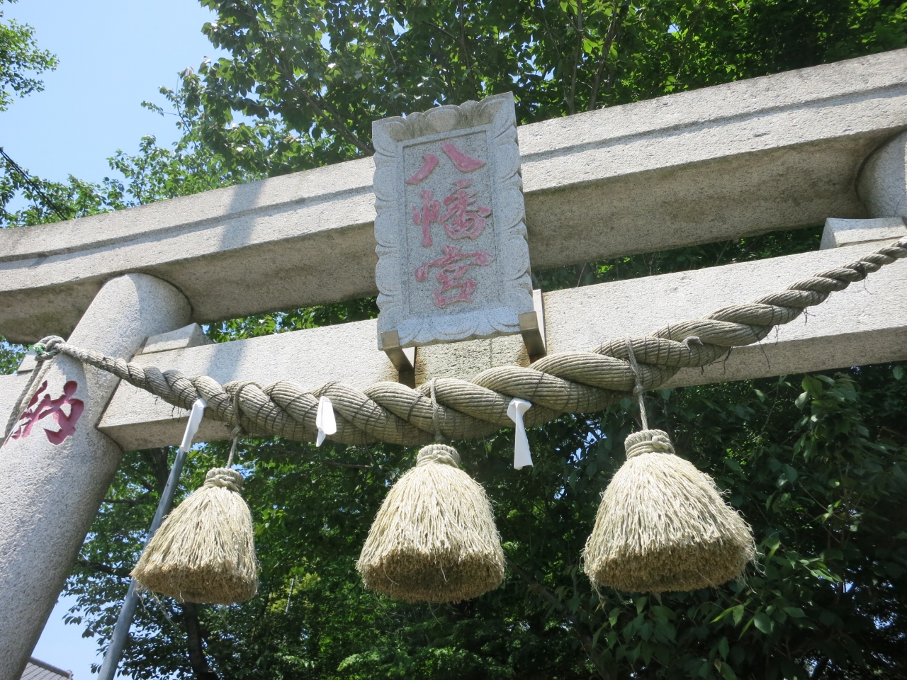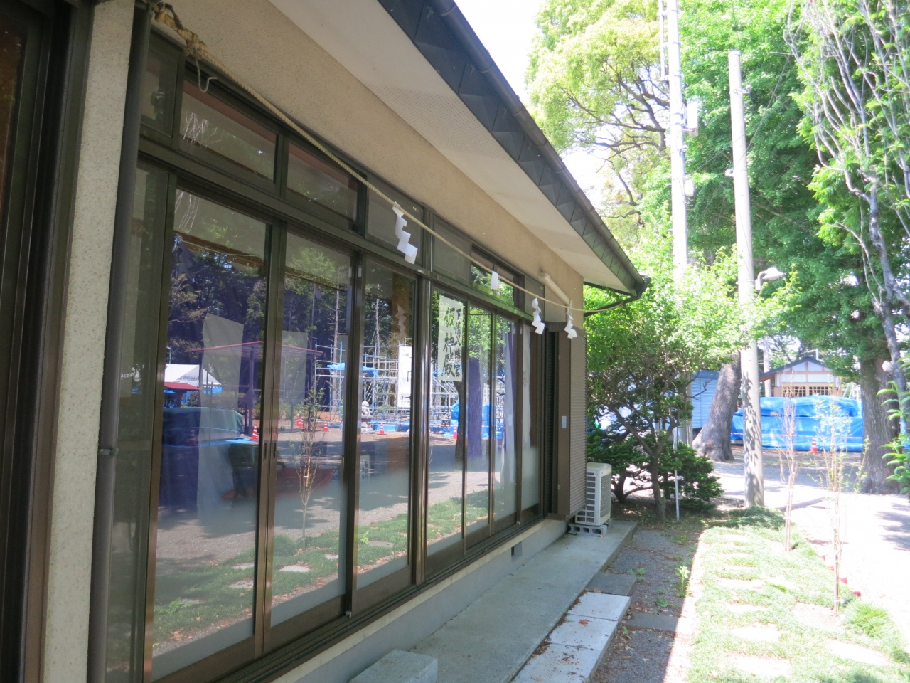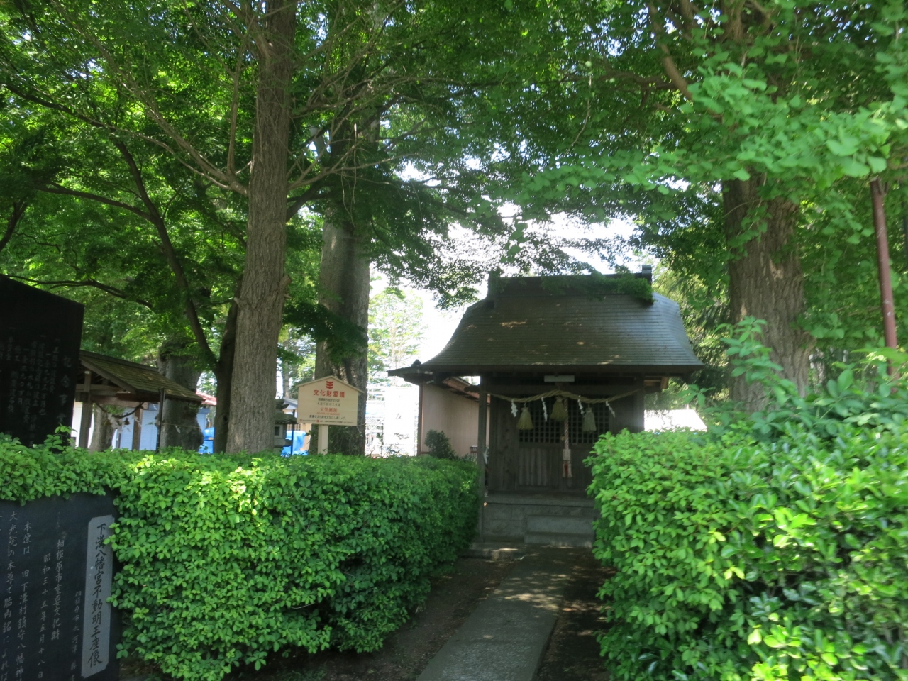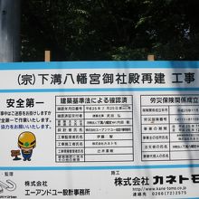 JR相模線下溝駅の東側にあります。戦国時代の天文年間に創建されたという由緒ある八幡宮ですが、2012年に火事により本殿が焼失してしまいました。現在(2014年5月)、再建工事中で、訪れた時には鉄骨が組まれジャングルジムのような感じで、建物はまだ姿を現してはいませんでした。