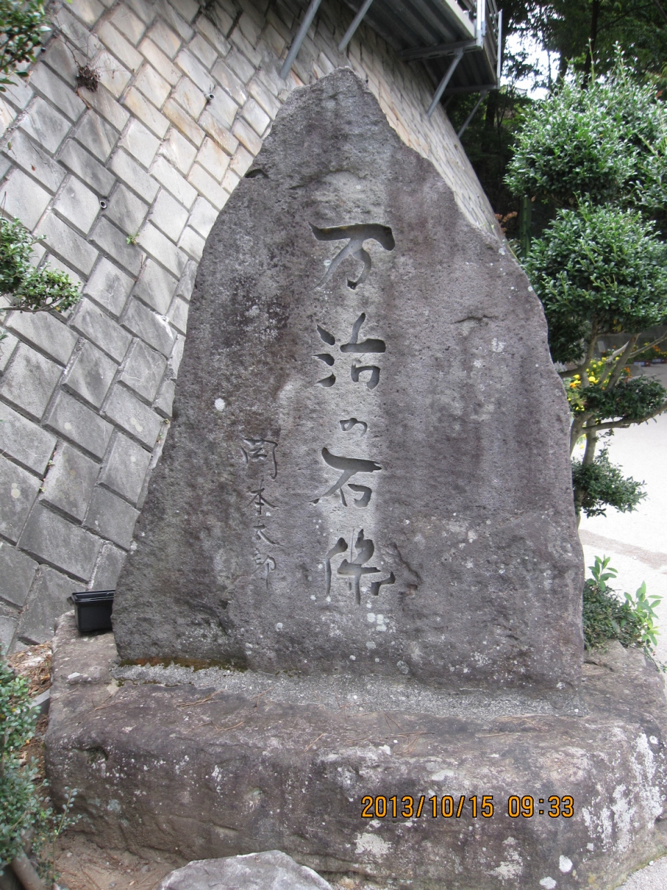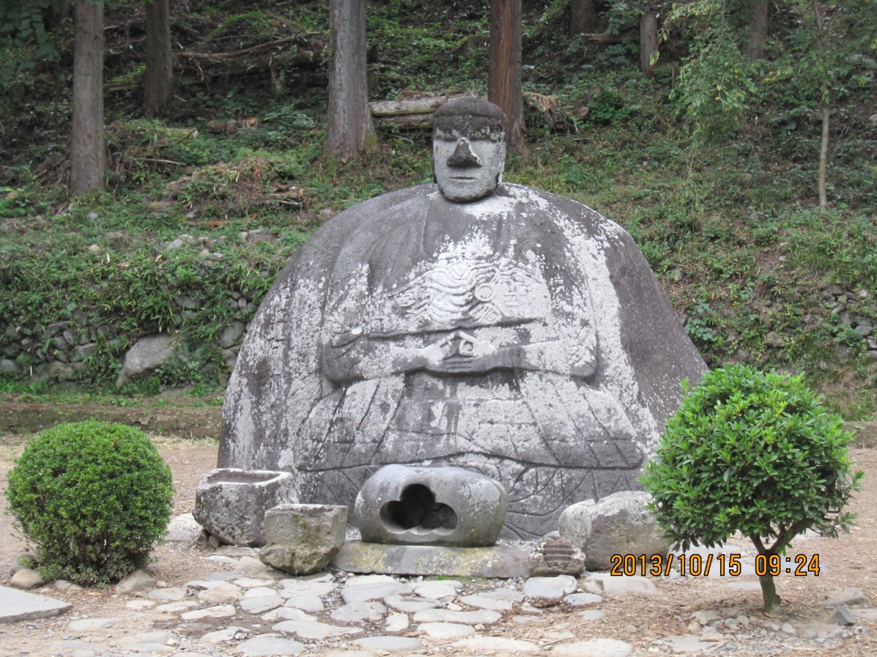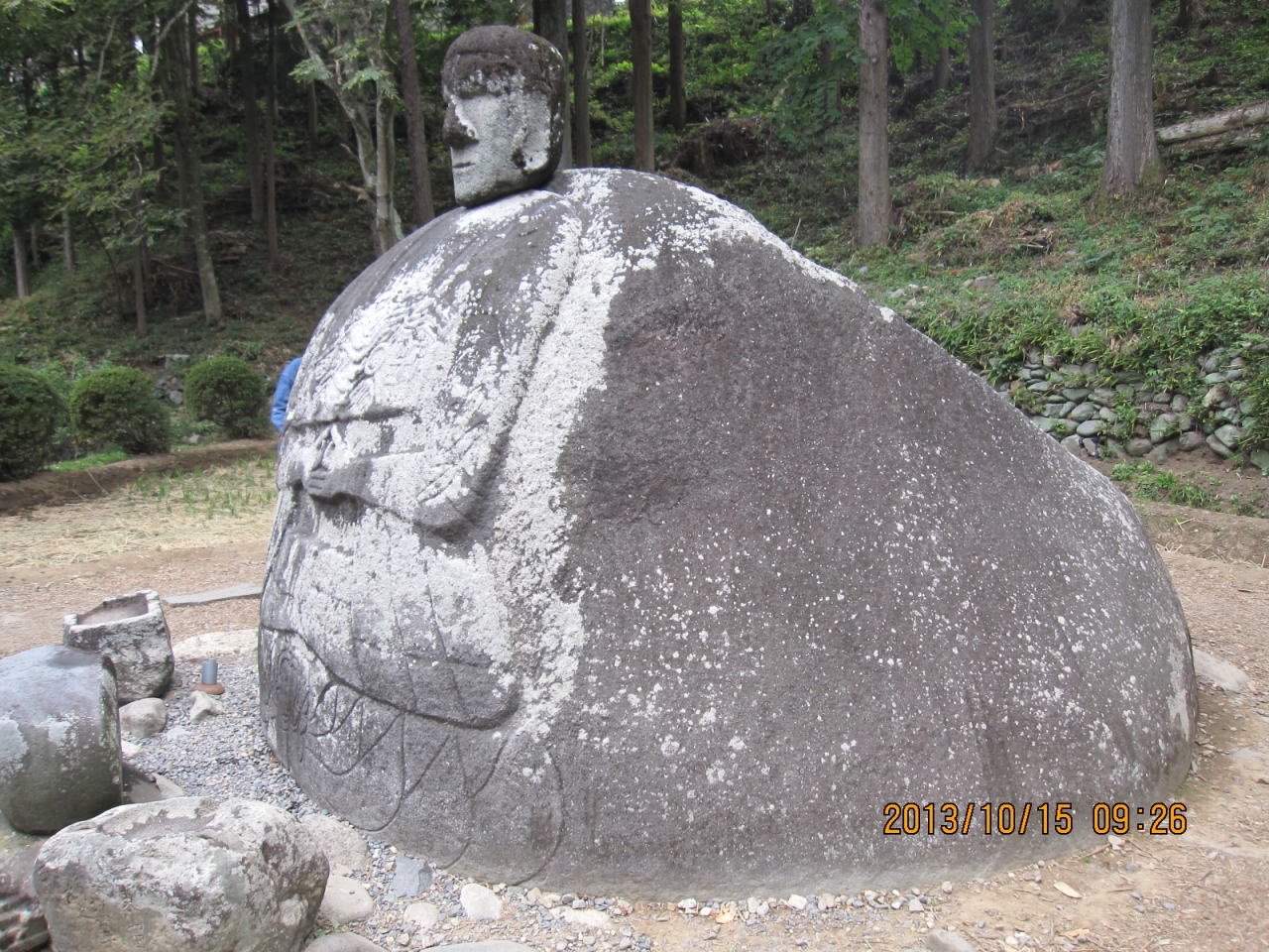 「諏訪大社下社春宮の鳥居を作るためノミを入れたところ、傷口から血が出てきたためにやめた」との伝説があります。巨大な岩石の胴体に、小さな頭が乗っかっている。アンバランスを極めたユーモアを感じる石仏です。この石仏を大絶賛したのが、かの有名な「岡本太郎画伯」で、参道の入り口に画伯直筆の石碑がありました。
